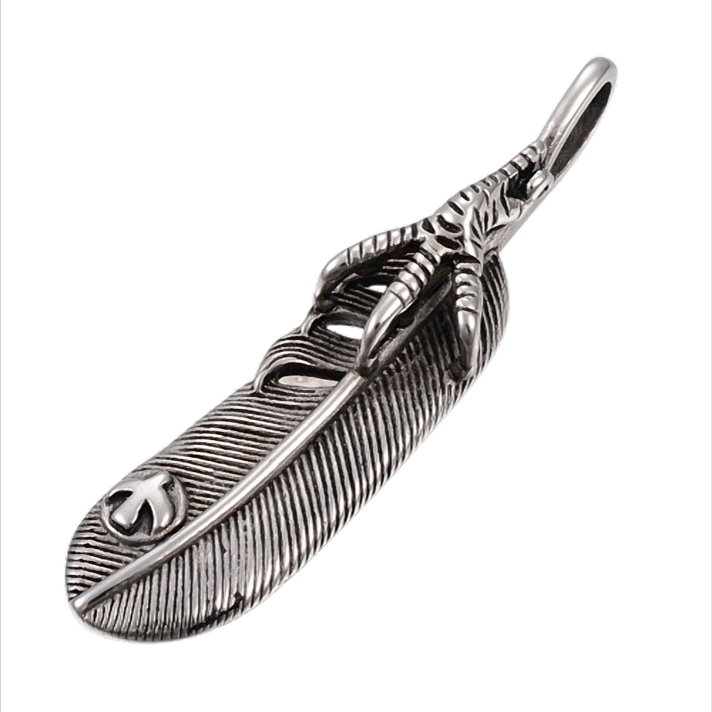 Dieser außergewöhnliche Kettenanhänger aus hochwertigem Edelstahl vereint die Symbolkraft einer detailreich gearbeiteten Feder mit der markanten Greifklaue eines Raubvogels.