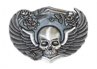 Versilberte Gürtelschnalle Buckle Totenkopf, Skull, Wings, Rosen, Biker, Chopper