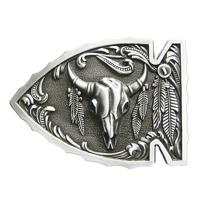 Gürtelschnalle Buckle Gürtelschließe Pfeilspitze Skull Longhorn Federn silber